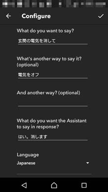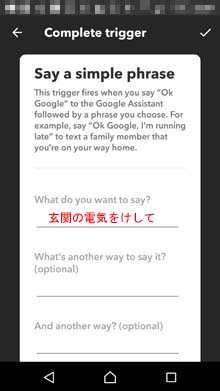 - そして、Google Asistantへの音声指示として、例えば、「玄関の電気をつけて」などの文を記載します。