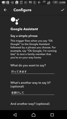 この時、Google Homeが返答する言葉としては、アプレットの作成1と同じように、「はい。いってらっしゃい」を入力しておきます。