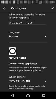トリガーのGoogle Asistantの言葉は「行ってきます」にしておき、これに対するNature Remoのアクションは「リビングテレビの電源」を選びます。