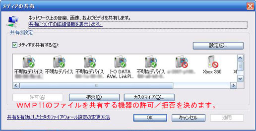 Windows Media Player 11のライブラリーファイルを共有できる機器の設定画面例